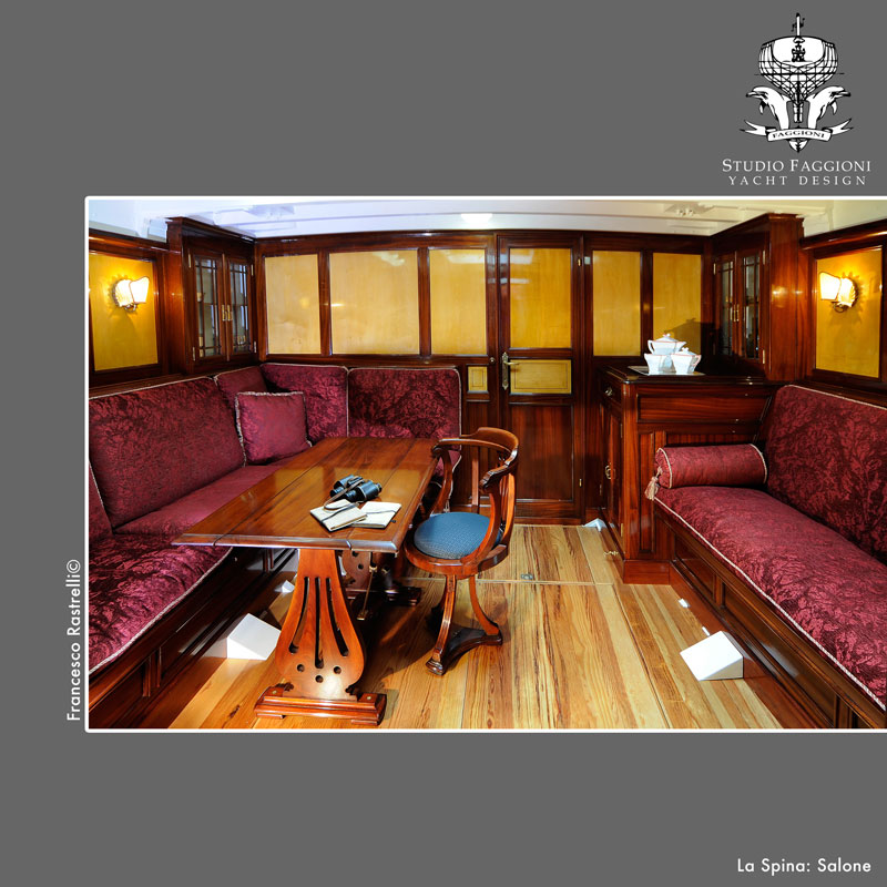 La fortuna di una barca è sempre determinata dal proprio armatore, così come la fortuna di un figlio dipende spesso dalle qualità del genitore. In questo senso, La Spina, yacht del marchese Franco Spinola, si può considerare particolarmente fortunata perché nata da una grande famiglia. Il gusto di Spinola e la sua passione per il mare hanno forgiato in questo 12 metri S.I. un doppio carattere: all'esterno ha la fisionomia di una figlia del vento, pronta a vincere nelle grandi competizioni e all'interno è una dimora di lusso. L'effetto è completamente inaspettato, data la sobrietà e quasi spartanità della coperta, che non concede nulla alle leziose comodità dello yacht. Credo che non sia casuale questa caratteristica che è anche tipica di molti grandi palazzi genovesi, che non ostentano all'esterno tutto lo sfarzo dei propri interni.