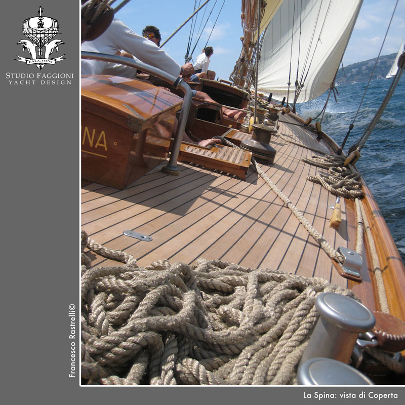 Questo de La Spina è un restauro peculiare perché molte scelte sono state prese in accordo con l'armatore, consapevole che la filosofia di progetto prevedeva l'utilizzo di tecniche e materiali tradizionali: sono, di fatto, completamente assenti resine epossidiche o pitture e stucchi bicomponente, che tendono a plastificare l'aspetto delle superfici, rendendolo troppo prefetto. Ecco che i naturali movimenti del fasciame nello scafo devono essere letti come valore aggiunto, non come imperfezione o fatiscenza.