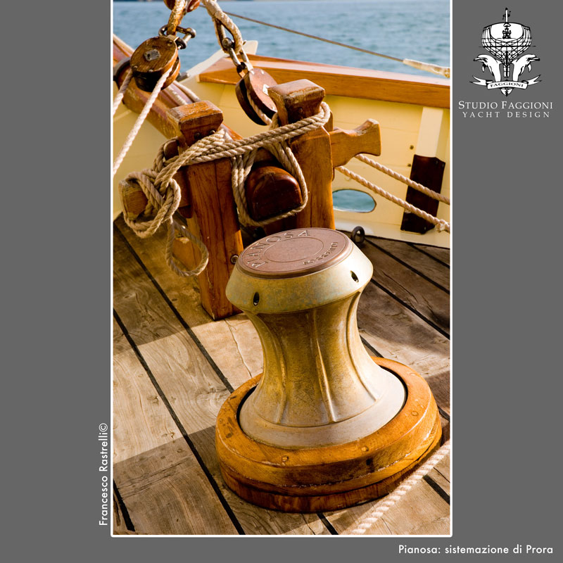 Come ? ovvio, Pianosa non monta pi? il motore del carro armato, bens? un pi? consono, affidabile e certamente pi? silenzioso Volvo Penta da 130 Hp. Quello che per? ho disperatamente cercato presso gli antiquari, ? tutta quella seria di oggetti che attraverso l'occhio datano la barca, come le luci di bordo interne ed esterne, i fanali di via, i bozzelli, volutamente diversi l'uno dall'altro e la bussola, non a caso americana e datata 1943, ancora dentro la sua scatola di legno fermata con una correggia di cuoio, pronta da sistemare al lato del timoniere. Il tutto, senza mai cedere all'oggetto troppo ricercato, pi? tipico dello yacht di lusso; anche se pu? apparire come un controsenso, definirei questo come un atto di ricercata spontaneit?.