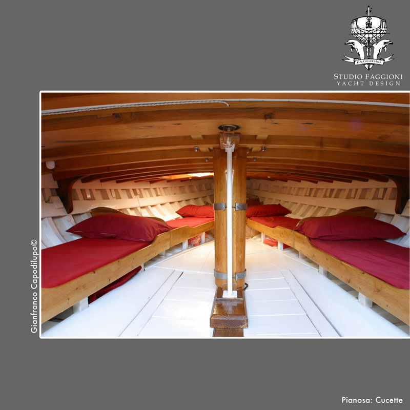 ? cos? che la tradizione del gozzo sorrentino, di cui ? detentore Giovanni Aprea, si fonde con le poche preziose informazioni ritenute degne di nota, come l'ex cofano motore, oggi tuga, dove trovano alloggio, in maniera discreta, un piccolo angolo cottura ed un bagnetto di servizio. Al suo interno, volutamente lasciato con la struttura a vista e senza paratie, trovano posto quattro comode cuccette addossate alle murate. Solo cos? facendo, si ? data la possibilit? di apprezzare dall'interno quel lento susseguirsi delle bianche ossature, che disegnano le forme di Pianosa con un ritmo perfetto.