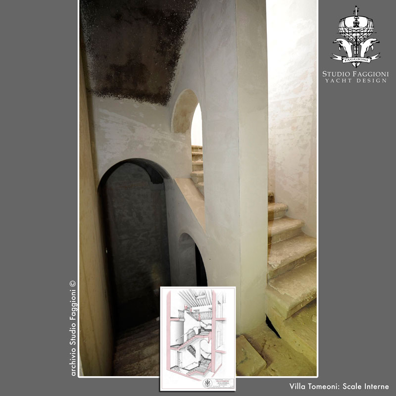 I piani della villa sono tra loro collegati all'interno da una scala rivestita in pietra serena.