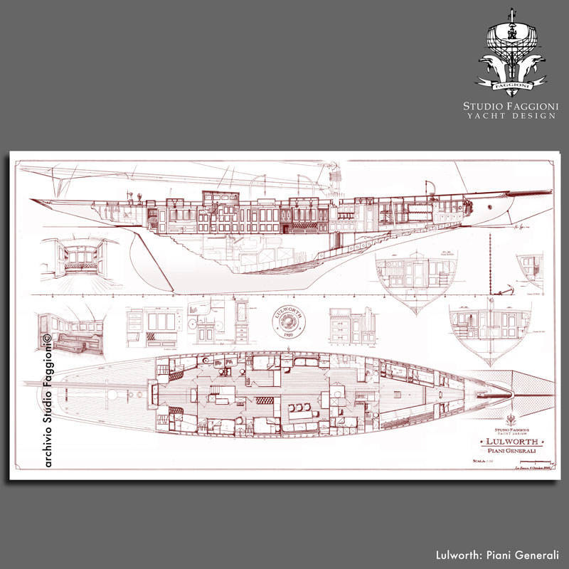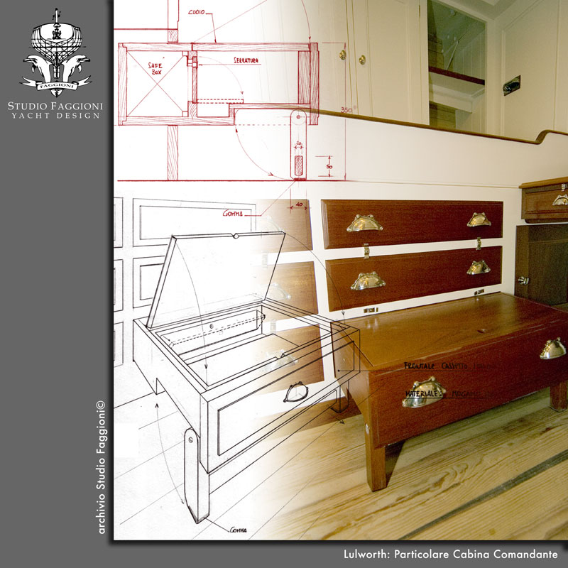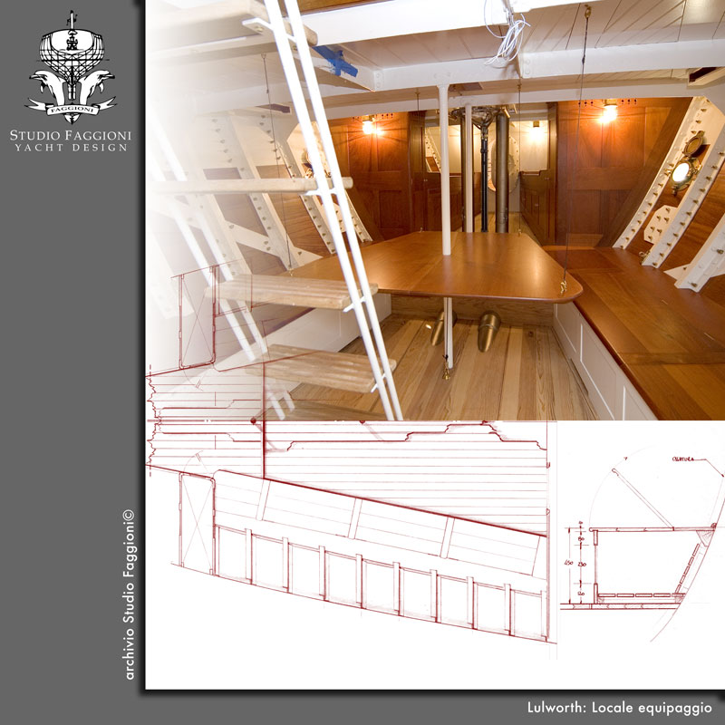 On the one hand, I had to deal with original bulkheads that needed to be put in place ? with the awareness that I had to place them exactly in the right spot ? and, on the other, with a 'stripped-to-the-bone' hull. Then, after the 'first step' and at long last having found their final location, I had to work around the existing elements in the drawing: it was an extremely complicated mental and design procedure. Also because, when a design, what's more hand-made, does not move for three or four months from your table, it starts to become heavy... you begin wanting to see it disappear and you force yourself to work on it at night to get to the desired final result. Moreover, there were many drawings of the boat, but they were all different from one another.