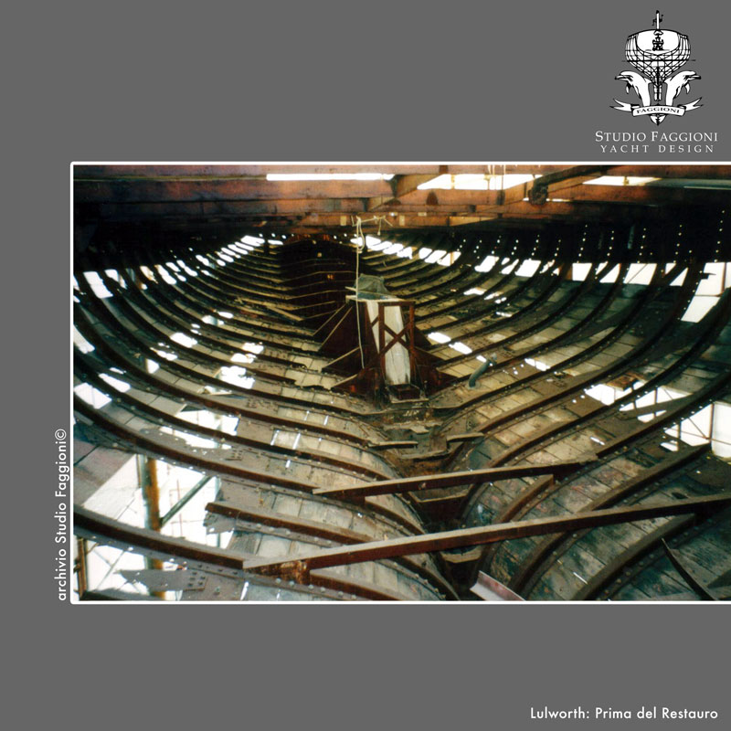 Unlike many other boats that today undergo restoration, we had to catalogue various parts of the existing interior (the saloon including up-and-over stanchions and table, the corridor's bulkheads, etc.): these were all scattered objects. Gathering, cataloguing and then physically locating them in space was certainly the longest work which went on till the end. What remained of the boat at the start of its restoration plan was basically the shell of the hull, while the still-existing interior elements were stripped and stored in boxes.