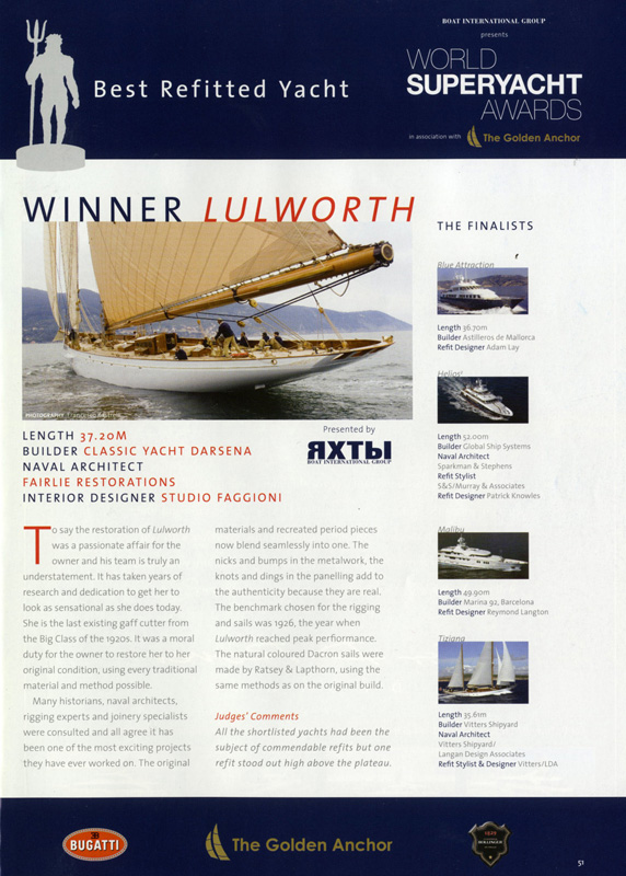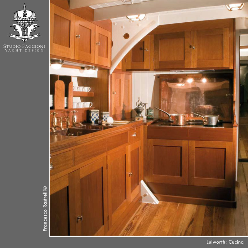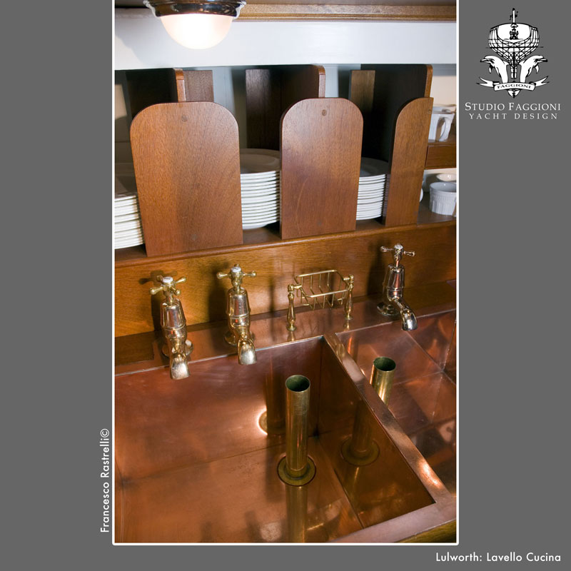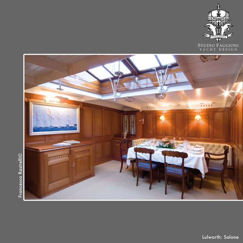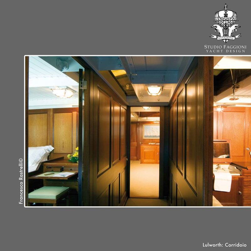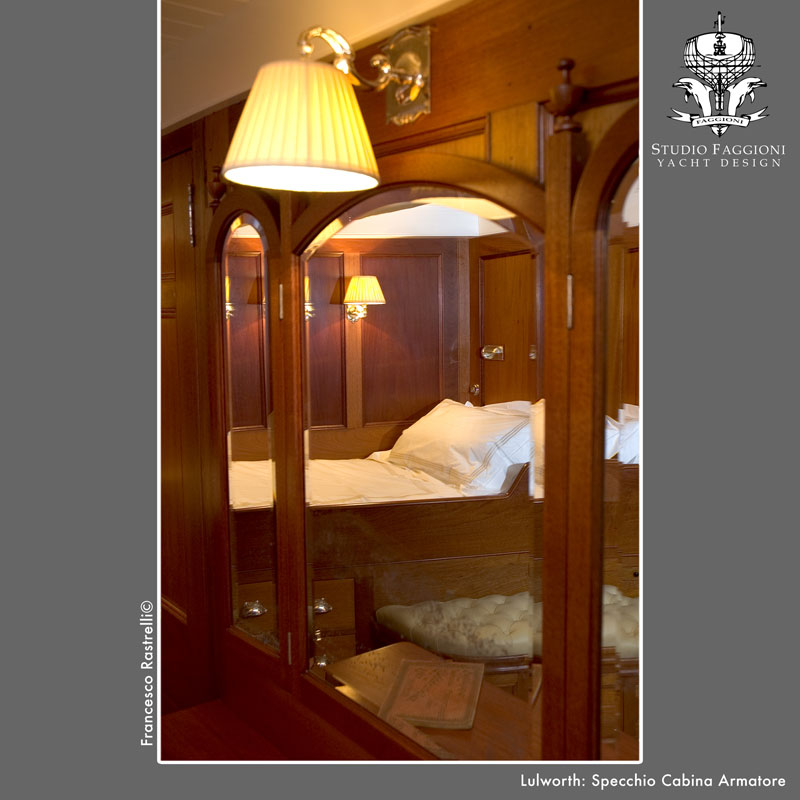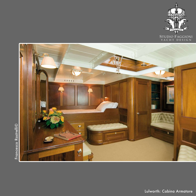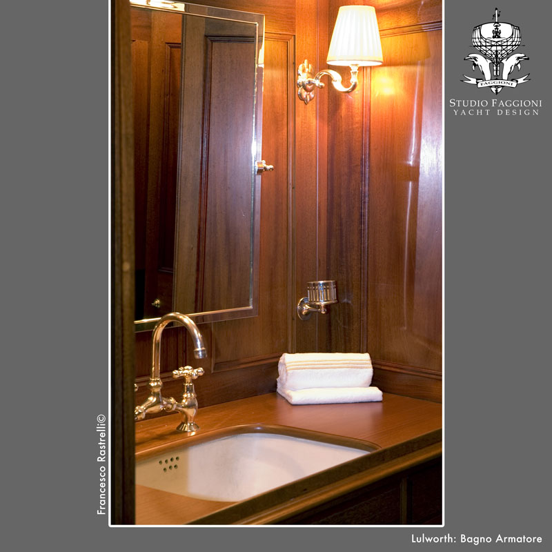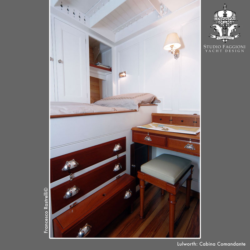 Adjacent to the owner's cabin, for example, in lieu of a previous bathroom ? no longer adaptable and feasible ? after many ups and downs, an open reading area was designed in line with the time when the boat was built, capable of making the cabin look larger and more comfortable, whereas the owner's toilette was completed with a philological type of work in line with nowadays' needs.