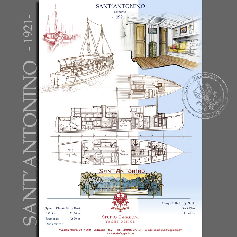 Sant'Antonino Sant'Antonino Shipyard: Aprea (IT) BoatLaunch Year: 1921 Boat Type: Classic Ferry Boat Hull length: 21,60 m Restoration work: Restauro Completo -preliminare Beginning Restoration work: 2008 End Restoration work: in corso Publications Link: WORK IN PROGRESS «« Back to Boats List ««