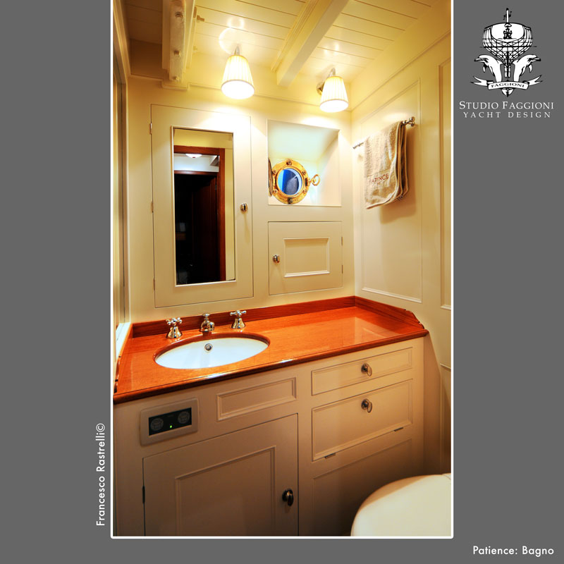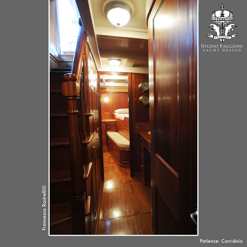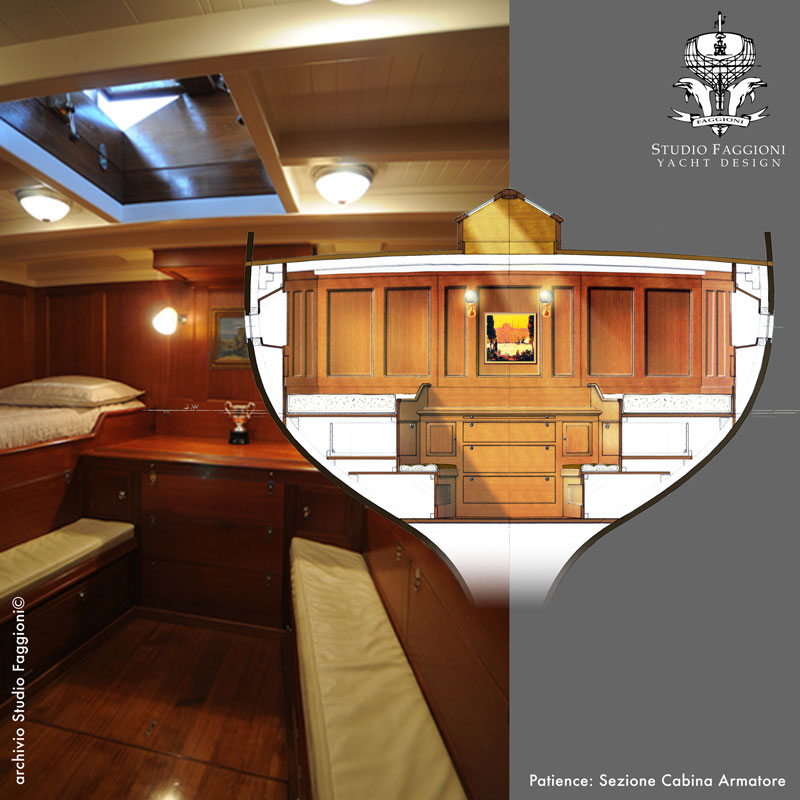 Gli interni non vogliono rivoluzionare i piani generali originali; tengo fermi alcuni punti come la posizione della cabina doppia di poppa (oggi cabina amatoriale), il bagno adiacente a questa cabina, reso pi? comodo, la cabina ospiti di dritta (ex cabina armatore) e, fondamentale, la posizione del quadrato, con la stessa disposizione dei divani. Impossibile, quanto assurdo, ripetere la soluzione originale della cabina di transito sul lato sinistro cos?, ho ricavato in questo spazio un bagno ospiti comodo ed una zona carteggio. Lo stesso dicasi per la zona a pruavia del salone dove trova alloggio una cabina a per due ospiti sul lato di dritta ed una cucina su quello sinistro; a prua estrema si trova il difficile alloggio dell'equipaggio.