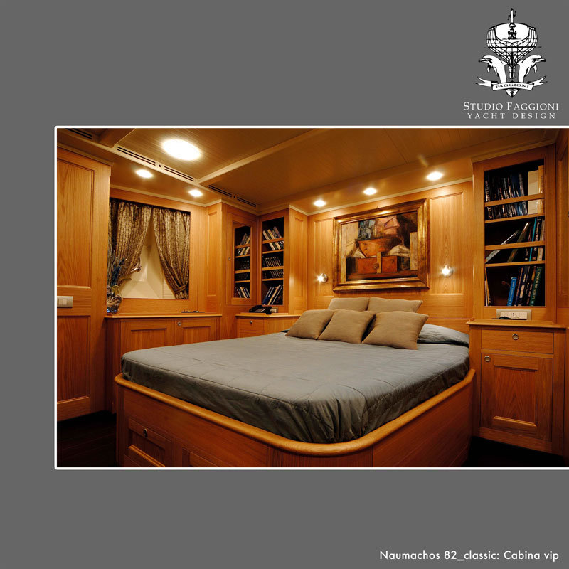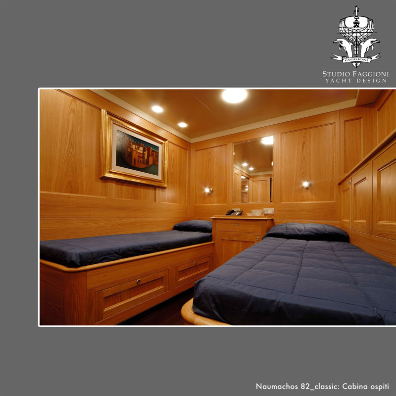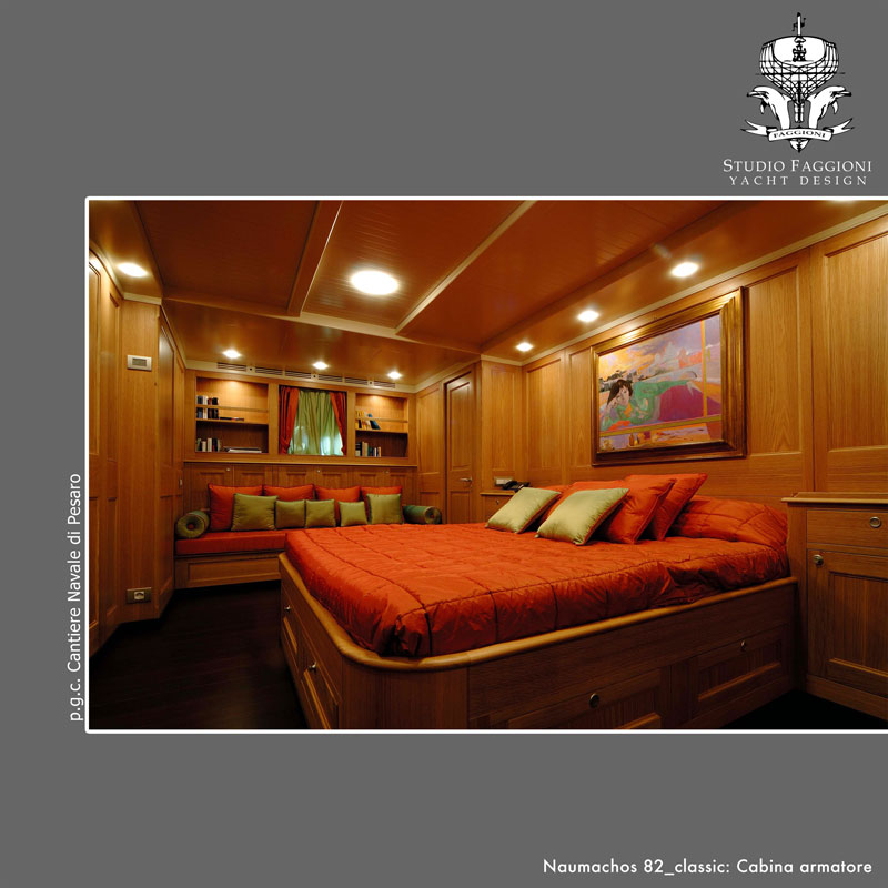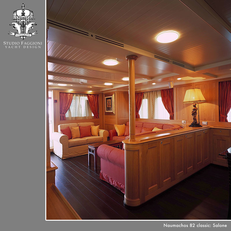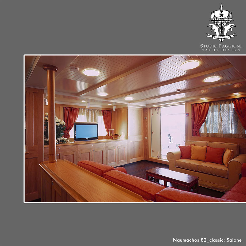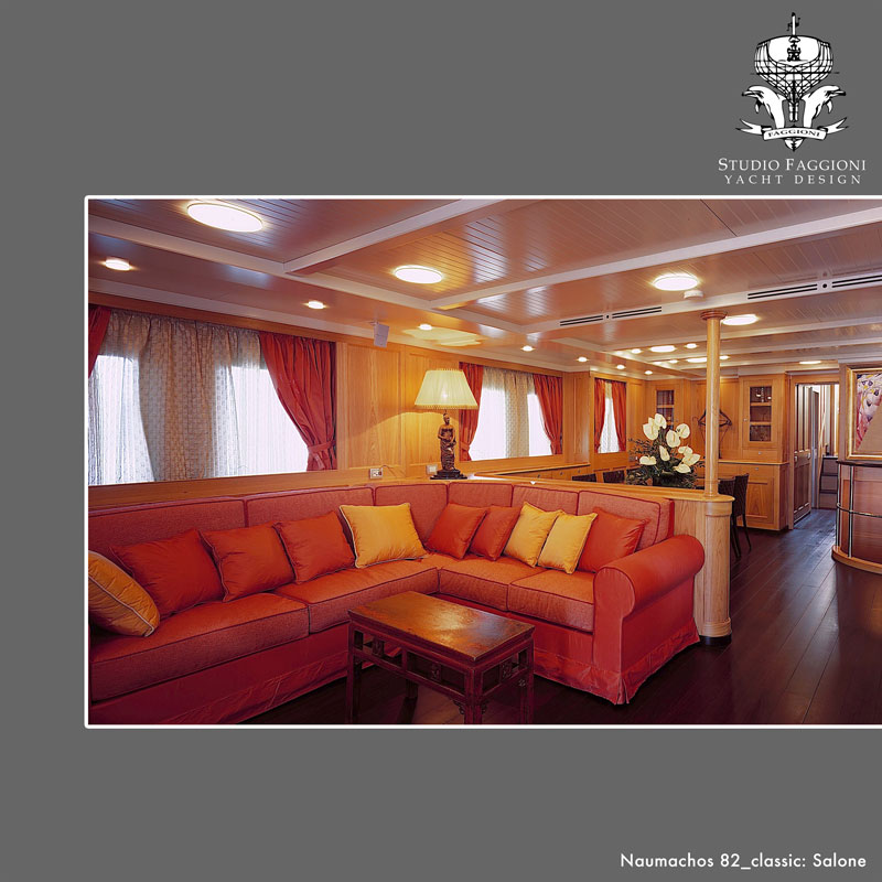 Il rovere degli interni, legno di grande tradizione marinara, non vuole porsi come arredo caratterizzante ma come rivestimento interno all'involucro, casa del viaggiatore arredata anche con pezzi etnici unici, a memoria dei luoghi pi? lontani visitati, come il tavolo da pranzo ricavato utilizzando la porta di un monastero tibetano del XIX secolo, o il baule cinese in cabina Vip nella prima unit? costruita. Una sorta di base neutra costantemente ritmata dalle ombre, che offre la sensazione di un ambiente conosciuto, amico, che faccia sentire al sicuro come a casa propria e che dia la voglia di aggiungervi con il tempo, strati di vita con nuove contaminazioni.