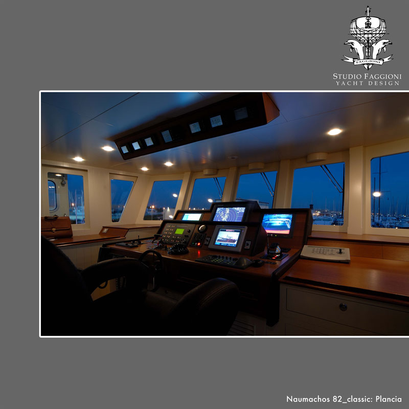 Nella plancia di comando, particolarmente densa di strumentazione, traspaiono le vere intenzioni di questo Explorer da 24 metri che non si limiter? certo alle crociere stagionali ma tenter? di arricchire questo "frammento distaccato della terra", di vita vissuta, unico elemento impossibile da conferire a priori con qualsiasi progetto.